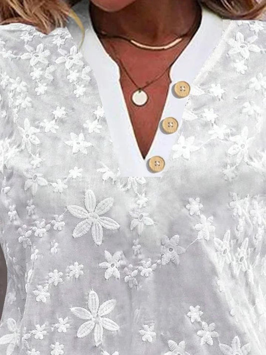 V Neck Embroidery Simple Cotton Plain Loose Blouse